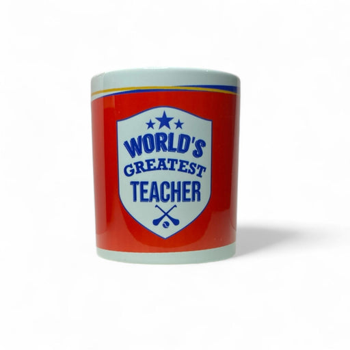 Mug with "Worlds greatest teacher" crest with crossed hurleys Perfect gift for your favourite teacher at end of term time or Christmas!
