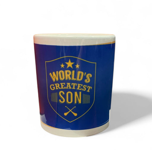 Mug with "Worlds greatest son" crest with crossed hurleys