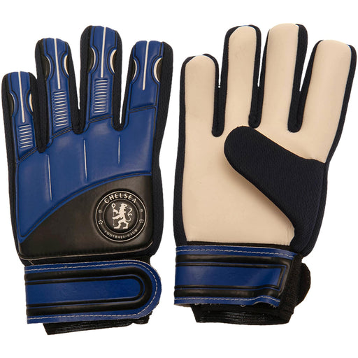 Kids Chelsea FC goalkeeper gloves BlueOfficial Chelsea FC club branding Adjustable hook and loop tape wrist straps Rubber palmsapprox age 7-9